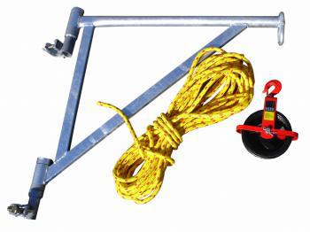 • výložník s okem vzdáleným 850 mm osově od trubky,  uchycení na rámové nebo trubkové lešení pomocí otočných závěsů s přivařenými spojkami pro průměr trubky 48,3 mm (pozinkováno)
